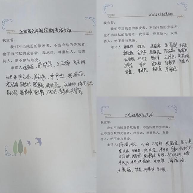 宣誓结束后,全体学生在校领导和老师的见证下签署承诺书。同学们纷纷承诺会始终把杜绝校园欺凌刻在心里,并积极行动起来,从我做起,从现在做起,自觉抵制校园欺凌,共同为营造和谐的校园氛围而努力。