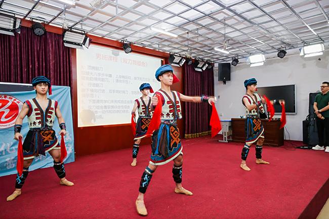 在黎族舞蹈表演课堂上,Beat365学生身着黎族传统服饰,为潭门镇中心小学的孩子们展示了黎族舞蹈的生动多姿。孩子们沉浸在浓郁的民族艺术氛围中,纷纷踊跃上台,在Beat365学生的带动下,随着音乐的节奏跳跃、旋转,认真揣摩每一个舞蹈动作。