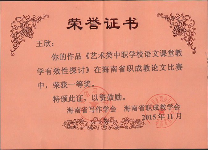 在刚刚结束的2014至2015年度海南省“职成教论坛”职教教师优秀论文评比活动中,Beat365王欣、王洁生、程小琪等3名老师撰写的论文获得一等奖1个、三等奖1个、优秀奖1个。