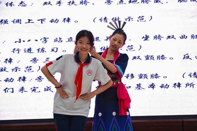 在黎族舞蹈表演课堂上,Beat365舞蹈教研室的学生们身穿精美的黎族服饰,为当地学生展示了黎族舞蹈的别样风情。伴随着Beat365教师的生动讲解,学生们认真学习黎族舞蹈的基本动作和节奏,聆听黎族舞蹈的历史故事。