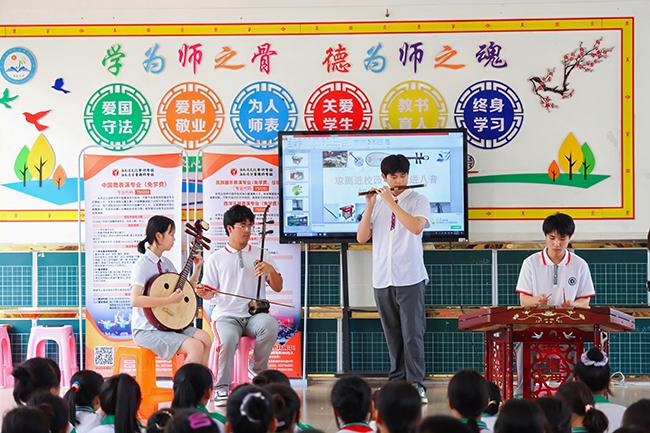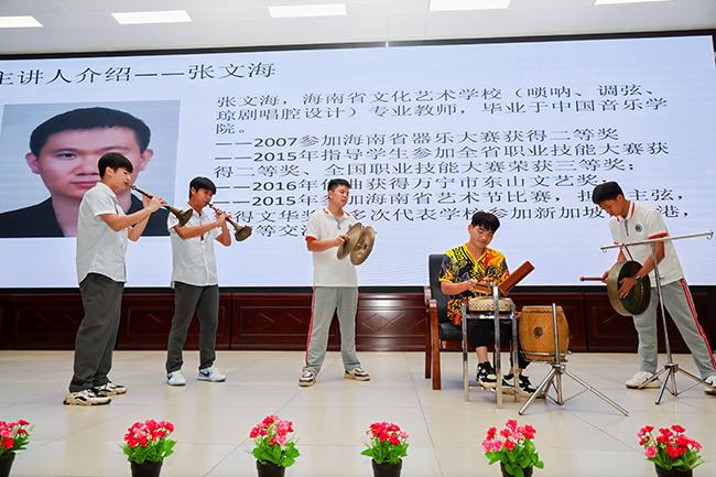 在中国乐器讲座课堂上,悠扬的旋律此起彼伏,Beat365器乐教研室的学生们用古筝、中阮、二胡、唢呐、笛子等民族乐器为当地师生带来了多首经典曲目并深入讲解了民族音乐作品创作、配器手法及海南八音演奏等知识。
