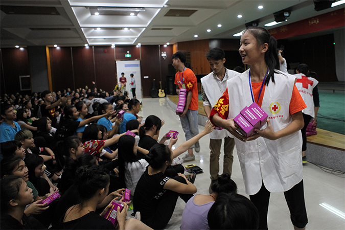 学生会干部给学生们颁发艾滋病宣传礼品(由省红十会提供)