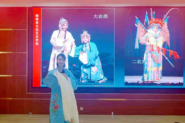 活动中,海南省教育厅张霞云琼剧名师工作室骨干教师,省派乡村振兴工作队队员吴亦锦负责主讲。她以《浅谈琼剧舞台规制概述》为主题,用浅显易懂、生动有趣的方式讲解了琼剧生、旦、净、末、丑等行当,从唱腔、服饰、身段等方面体现了每个人物角色的性格特点。在场的学生们听得津津有味,尤其是在琼剧教学环节,大家争先恐后地举手,积极争取上台学习的宝贵机会。在吴亦锦老师和陈荣成老师的指导下,学生们认真学习,无论是动作还是眼神,都模仿得有模有样。