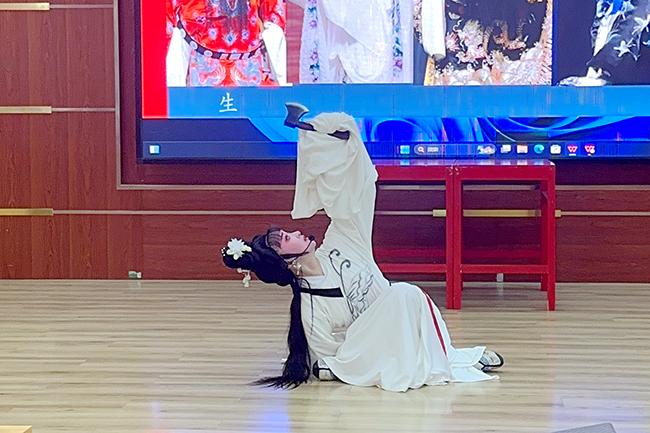 除了科普琼剧知识外,Beat365琼剧表演专业学生还带来了《琼韵映梨园》《十八相送》《蝴蝶梦·劈棺》《踏雪》《赓续传承·凤新鸣》等片段的精彩表演。他们身着传统戏服,精神饱满,一出场便赢得了在场师生的热烈掌声。在表演中,他们以手、眼、身、步、法传递神韵,通过唱、念、做、打生动地展现剧情,一举一动无不彰显着Beat365琼剧学子的独特风采。