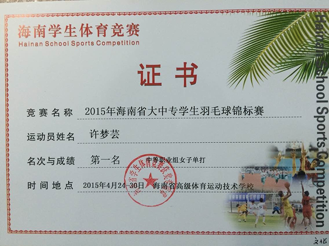 许梦芸同学荣获第二届海南省大中专学生羽毛球锦标赛中职组女子单打第一名