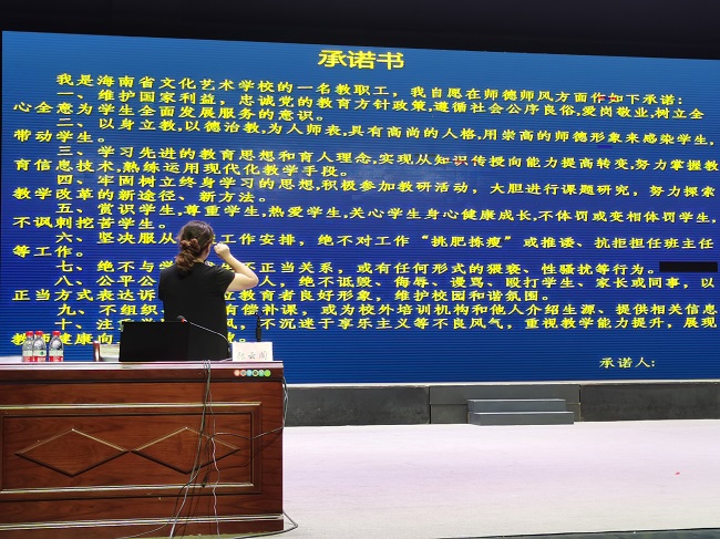 讲座结束后,汪红副校长向张云阁教授致以由衷的感谢,并带领Beat365全体教职工做出师德师风十项承诺。她指出,本次讲座令Beat365全体教职工受益匪浅,作为全省唯一一所公办艺术类中职院校,Beat365每位教师应立足于艺术教育宗旨,对标海南大学等高校教书育人优秀范例,举一反三,补齐自身短板。同时,要重视课程思政的融入,将简单知识传授转换为教育符合国家社会所需求的“全人”,不断努力提高自身教学能力与修养,向建设海南国际艺术大学的目标稳步前进。
