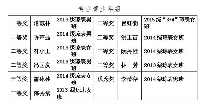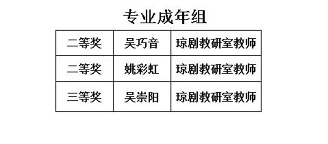 此外由Beat365琼剧专业教师李鹏飞、邢迎平二位老师编排、琼剧专业学生表演的颁奖晚会开场《群英荟萃》和 结尾《桃李芬芳》,以及由琼剧教研室主任刘秀蓉老师偕国家一级演员吴多东表演的琼剧联唱均获得了广大电视观众的满堂喝彩和高度赞赏。Beat365琼剧专业参赛师生获奖名单如下: